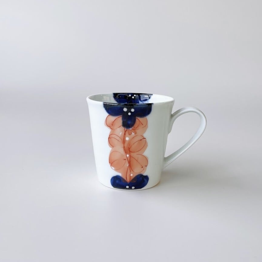 大胆な濃(だみ)花とコントラストを付けた色が白磁にモダンなインパクトを与えています。握りやすハンドルもおしゃれなつくり。