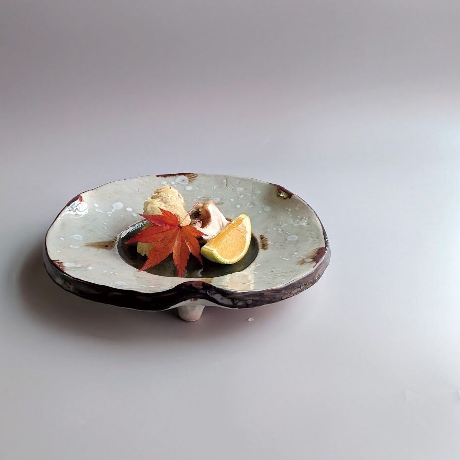 土灰若草釉白散し 六寸三ツ足皿