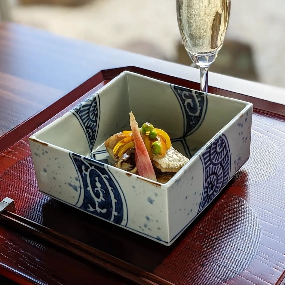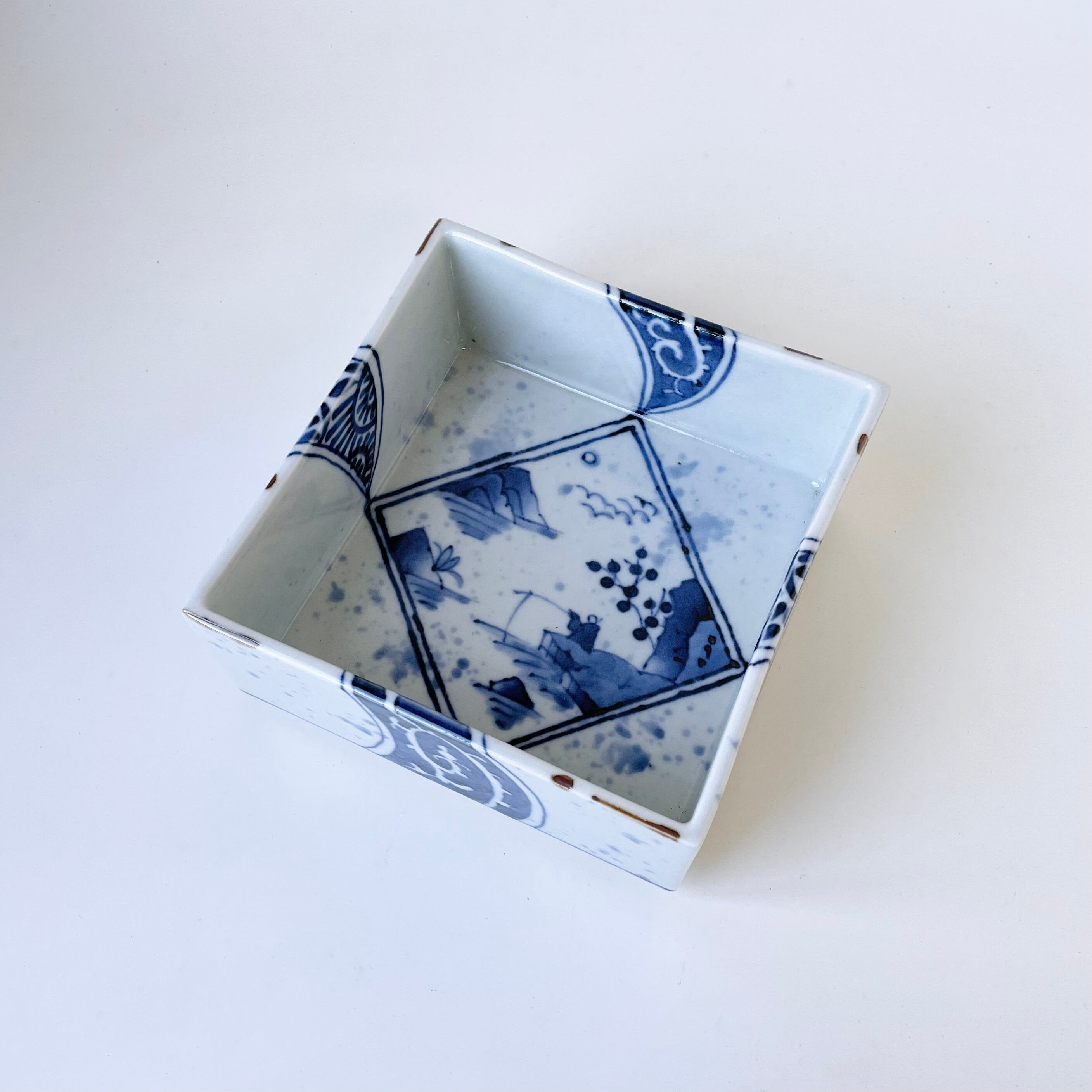 【SALE】染付囲み山水捻り紋 五寸足付正角向付